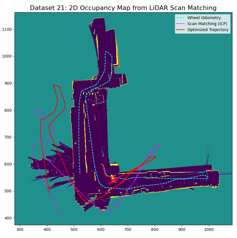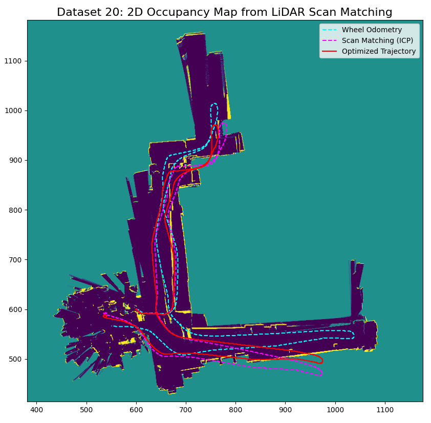 - Scan Matching & Odometry: Implemented the Iterative Closest Point (ICP) algorithm with a Kabsch solver to align 2D LiDAR point clouds, using time-synchronized wheel odometry for robust initial pose estimation.