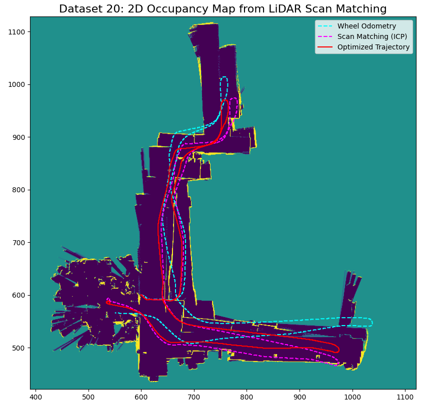 Occupancy grid map for dataset 20 using wheel odom (left), scan matching (middle), optimized (right) trajectory