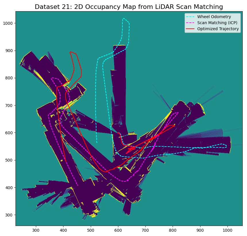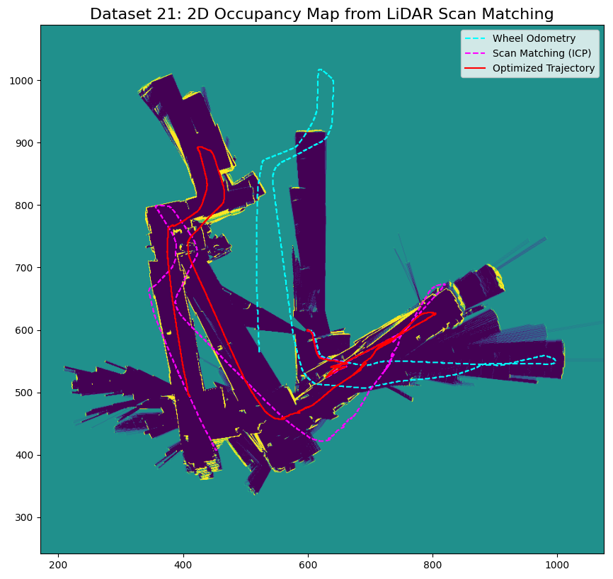 Occupancy grid map for dataset 21 using wheel odom (left), scan matching (middle), optimized (right) trajectory